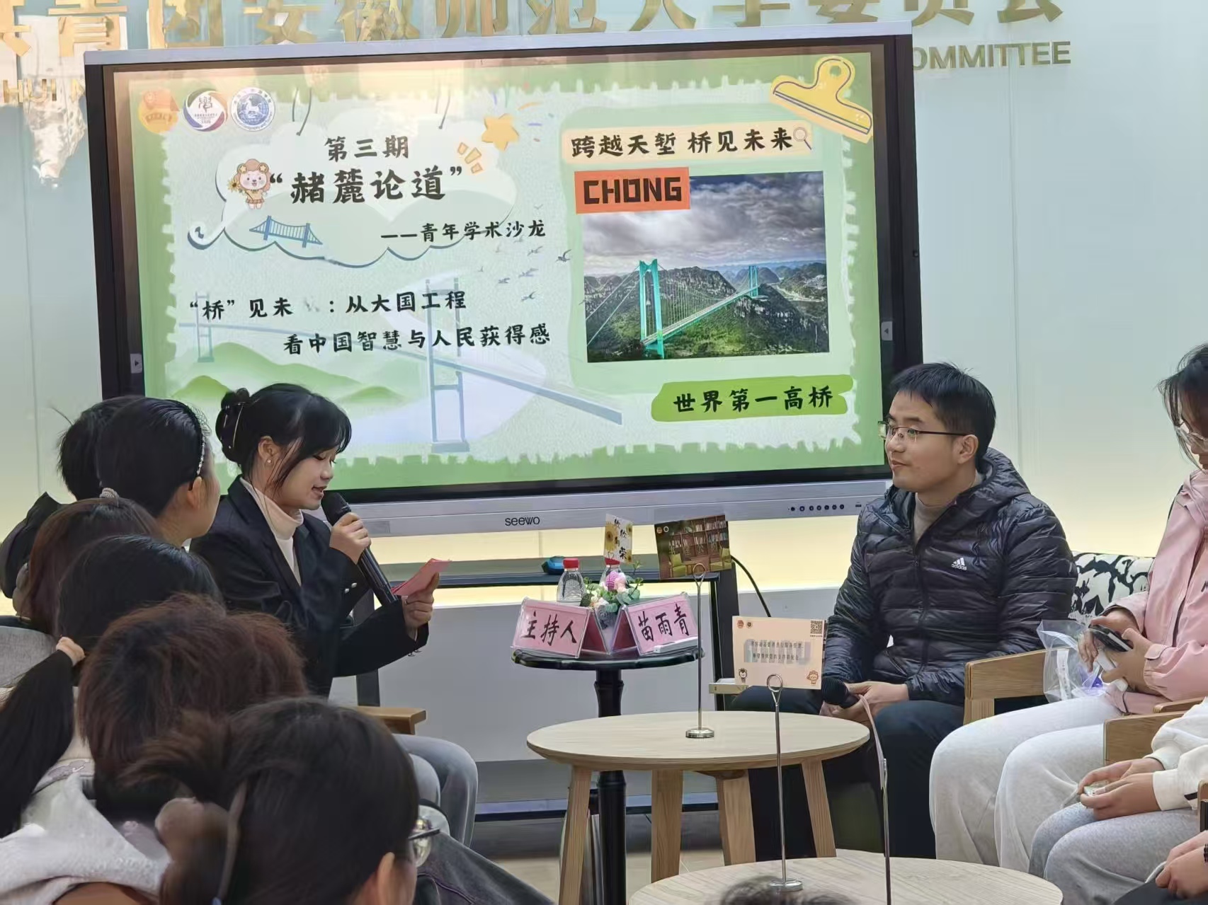 2025 年 11 月 26 日,由安徽师范大学学生会主办、地理与旅游学院学生会承办的第三期 “赭麓论道”青年学术沙龙,在花津校区大学生活动中心望道书屋顺利举行。本次活动以 “‘桥’见未来:从大国工程看中国智慧与人民获得感” 为主题,特邀地理与旅游学院副教授苗雨青老师主讲,15 名全校不同专业本科生参与,通过主题分享、互动思辨、实操模拟等形式,共探贵州花江峡谷大桥的地理逻辑与发展价值。
