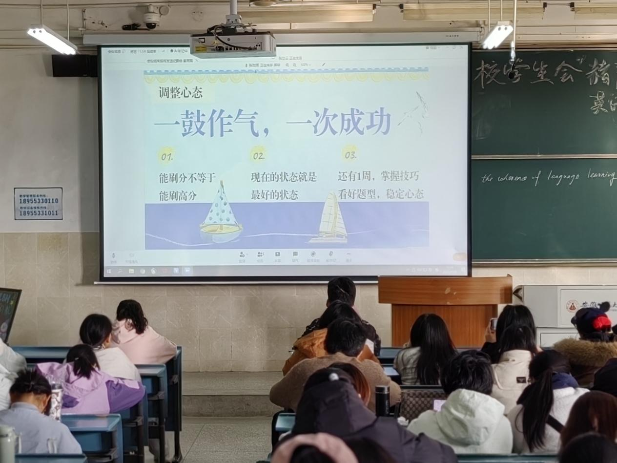 2025年12月6日,由安徽师范大学校学生会主办的“赭麓引航”英语四六级备考经验分享会,在花津校区行知楼及赭山校区教学楼顺利举行。本次活动采用线上线下相结合的方式,以“助力学生科学备考、提升应试能力”为目的,特邀往届高分同学,围绕备考策略、答题技巧、心理调适等关键议题与同学们展开交流,为正在备考的同学提供系统而实用的指导。