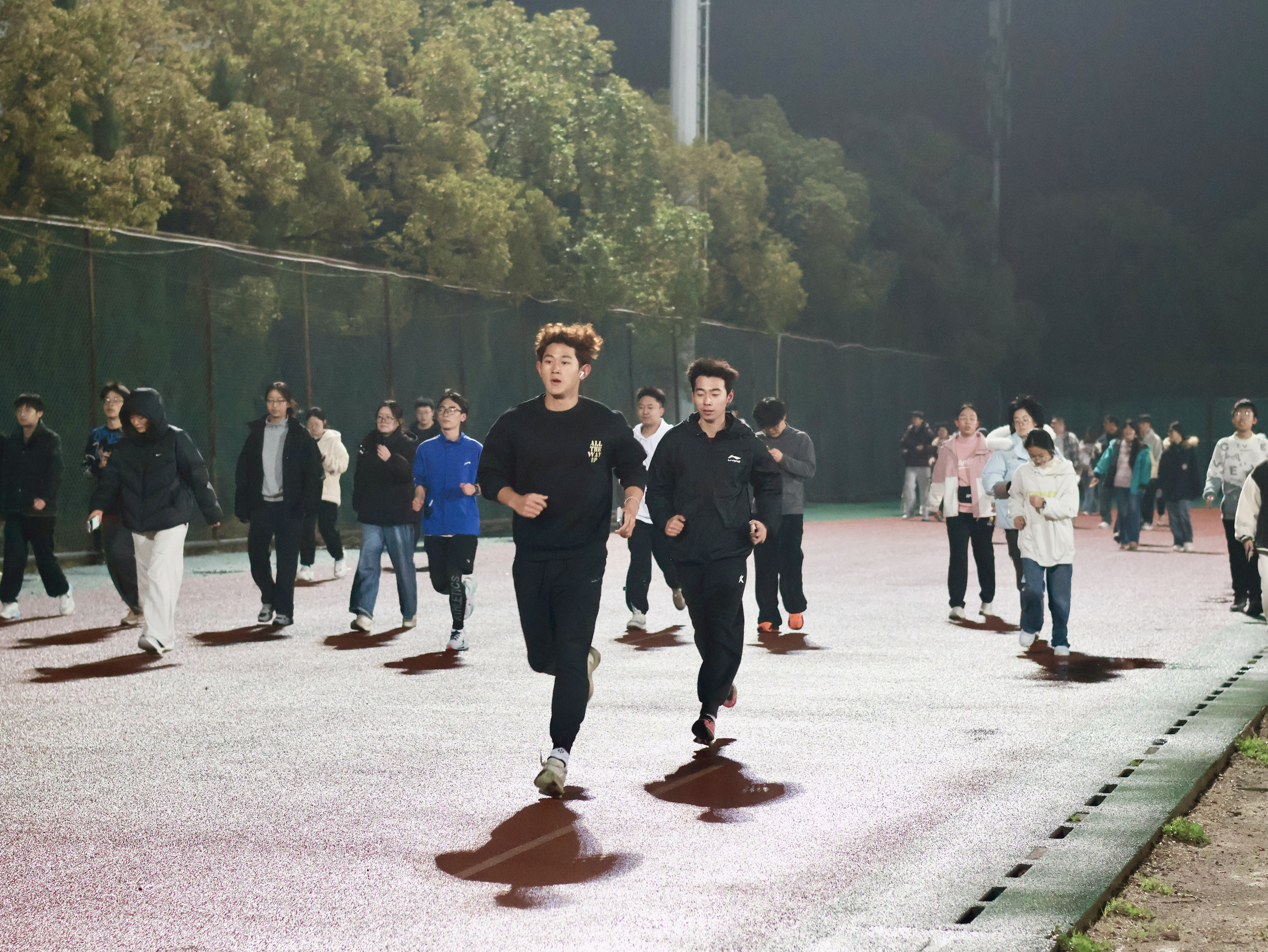 活动伊始,同学们通过系统的热身操舒展筋骨,为夜跑活动的安全有序开展打下基础。随着启动号令发出,大家结伴而行,在动感音乐的烘托下有序出发 。赛道经过精心布置,悬挂节气主题标语,将春分文化元素与青春运动氛围有机融合,营造出浓厚的活动气氛。
